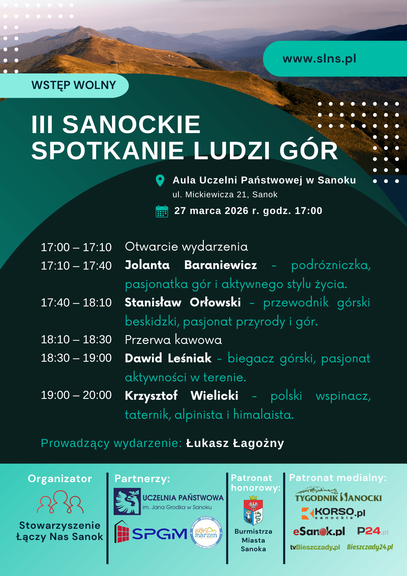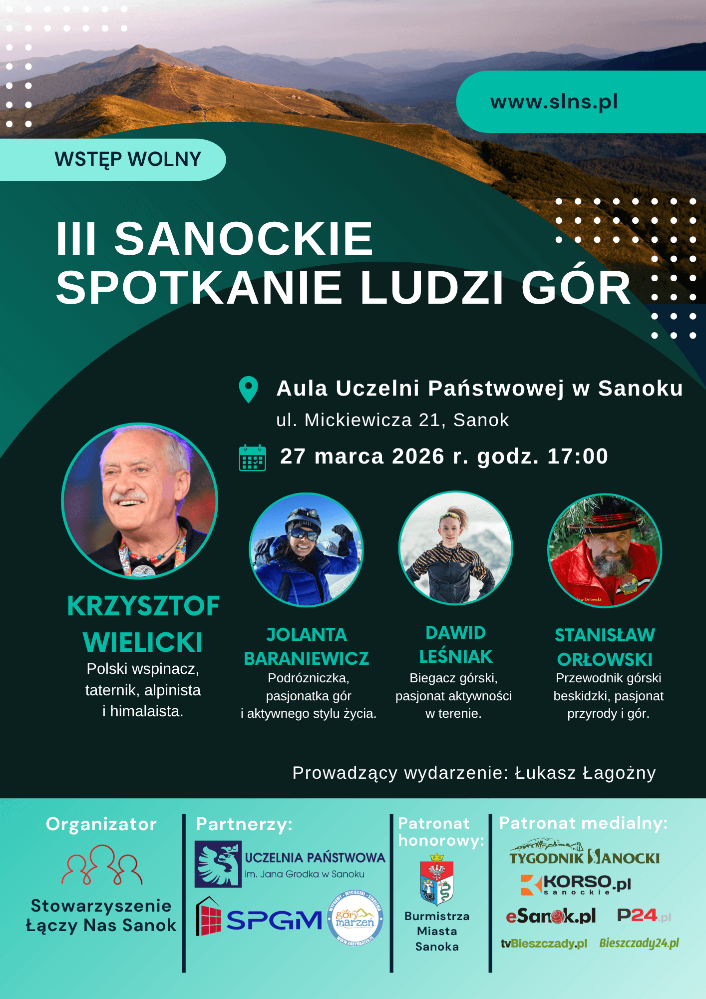 Stowarzyszenie Łączy Nas Sanok zaprasza na III Sanockie Spotkanie Ludzi Gór – wyjątkowe wydarzenie skierowane do wszystkich miłośników gór, podróży oraz aktywnego stylu życia.